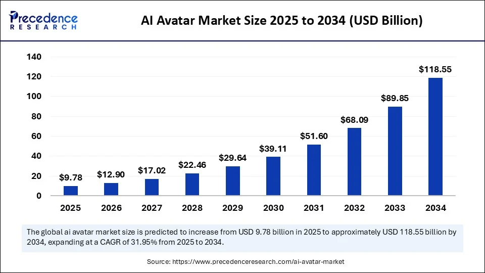 The AI avatar market is rapidly growing. Precedence Research states it was USD 7.41 billion in 2024, expected to rise from USD 9.78 billion in 2025 to about USD 118.55 billion by 2034, with a CAGR of 31.95% from 2025 to 2034. The growth is fueled by demand for personalized, scalable AI coaching.