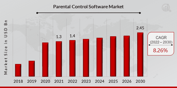 The global parental control software market was valued at USD 1.3 billion in 2021 and is projected to grow from USD 1.4 billion in 2022 to USD 2.45 billion by 2030, exhibiting a compound annual growth rate (CAGR) of 8.26% during the forecast period.