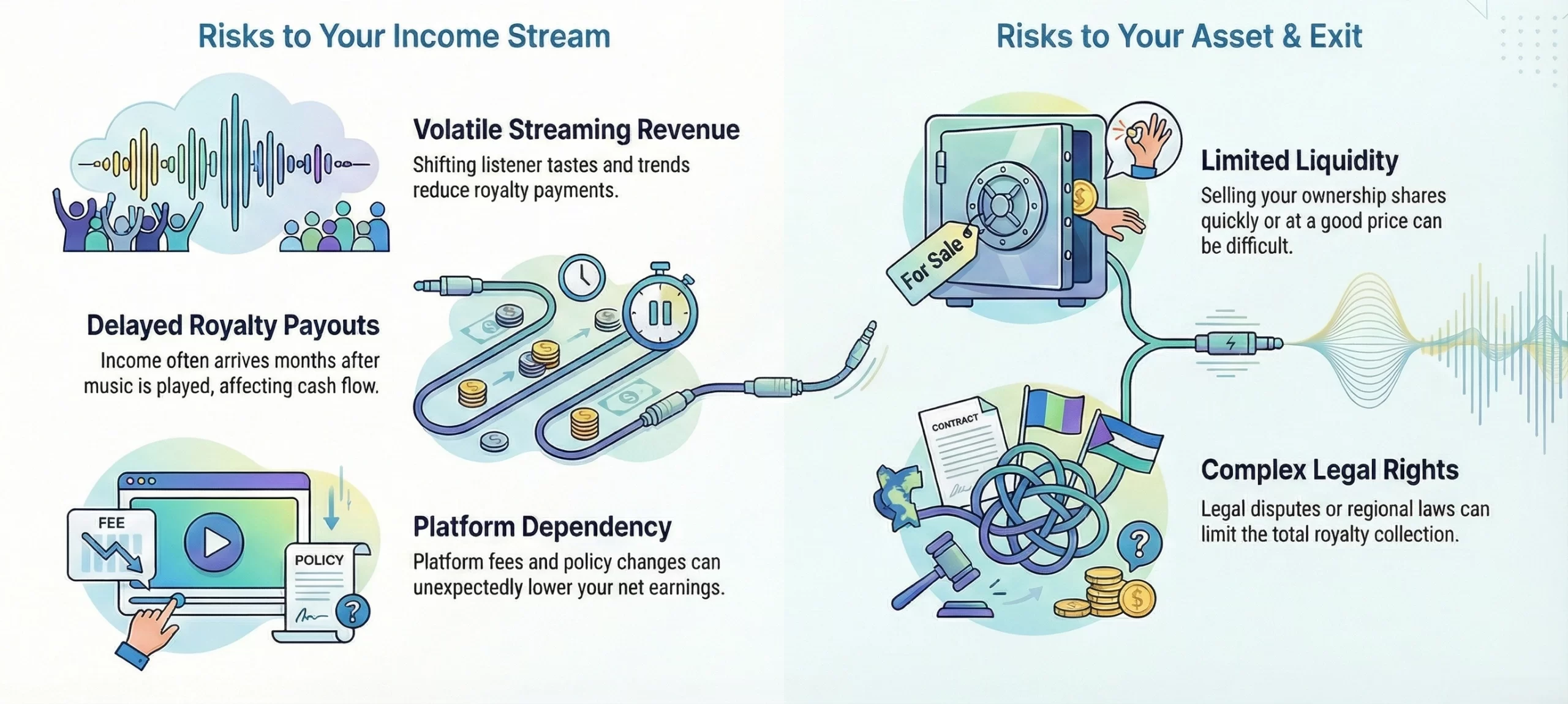 Fractional music ownership does not always offer easy exit options. Secondary markets may lack consistent demand, which can restrict an investor’s ability to sell ownership shares quickly or at favorable valuations.