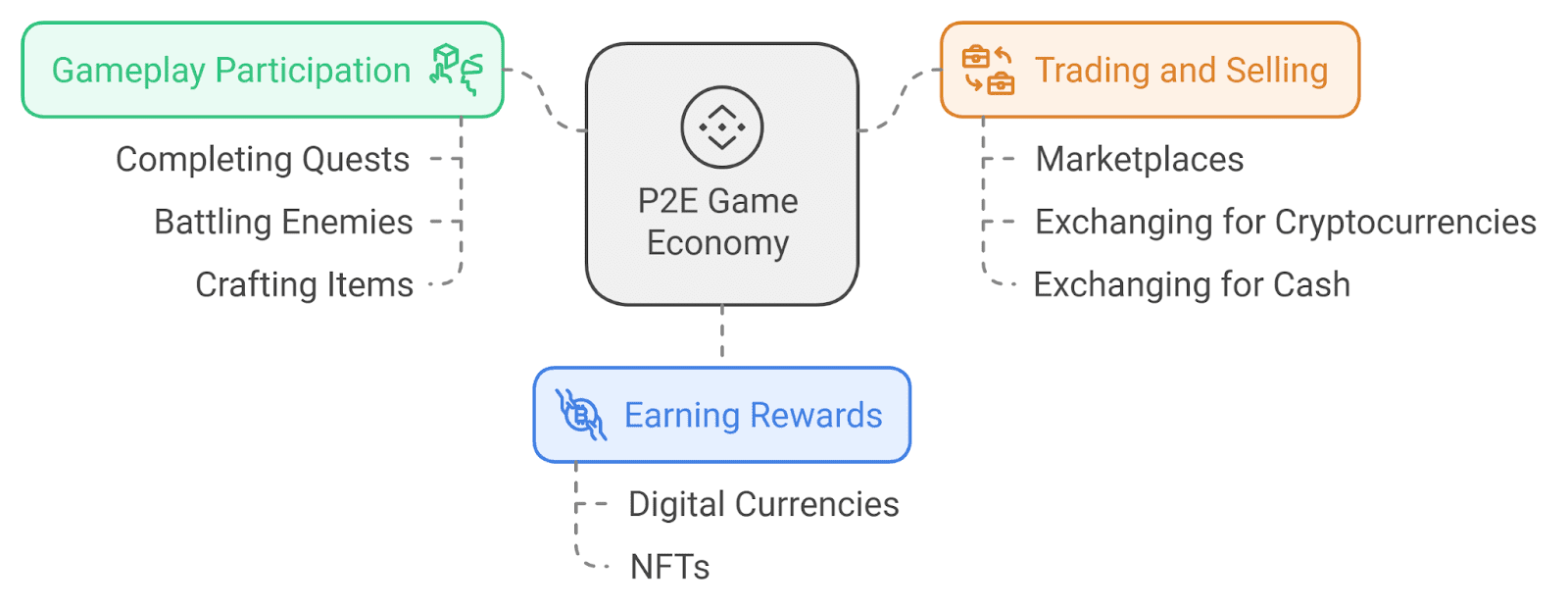 The economy in play-to-earn games works a lot like a country’s economy. Businesses in these games act like central banks, managing the game’s finances to keep everything balanced and growing. Here are the key parts: