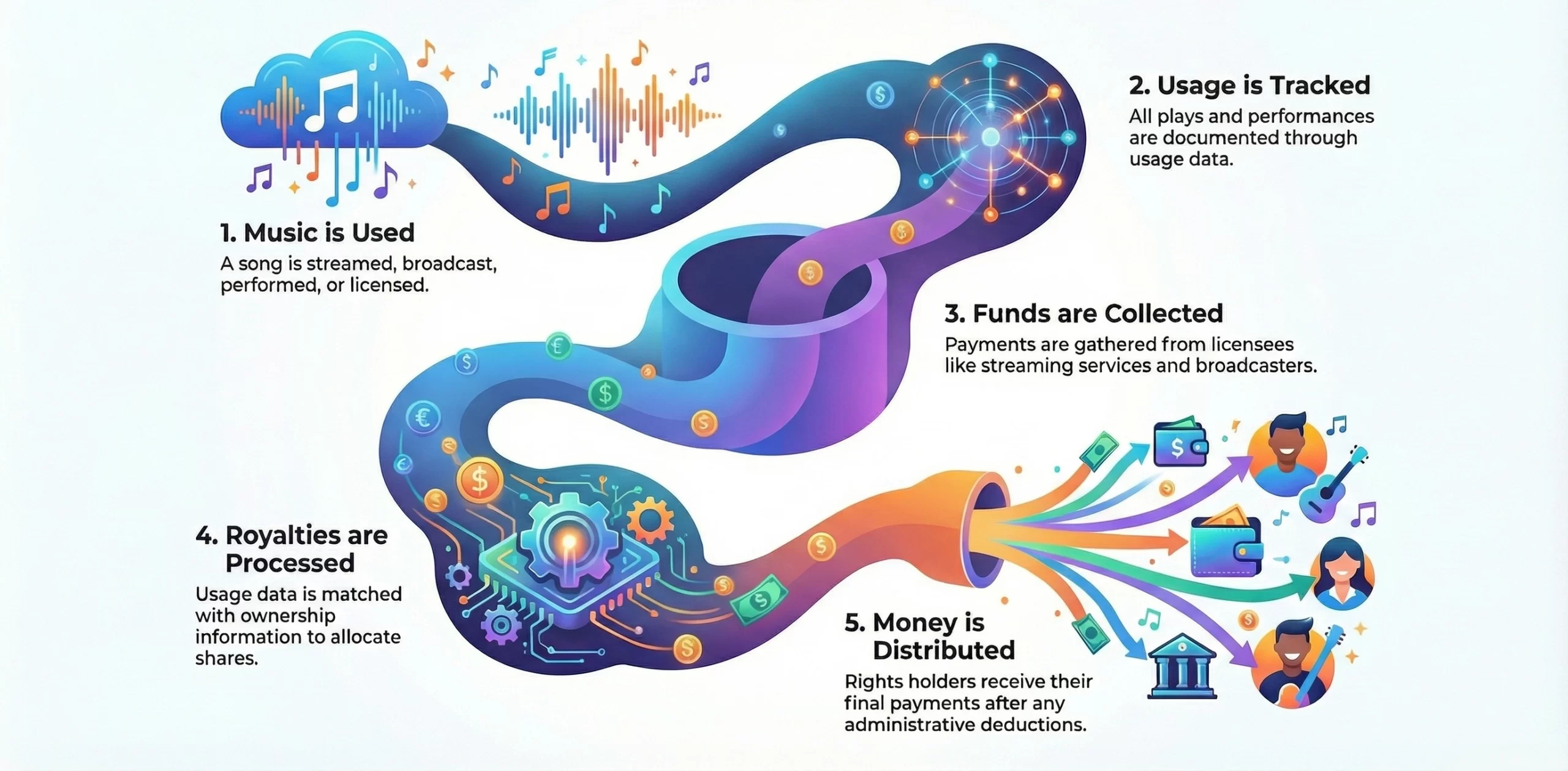 This layered structure makes manual royalty tracking inefficient at scale, creating the economic need for centralized systems that can aggregate, process, and distribute revenue accurately.