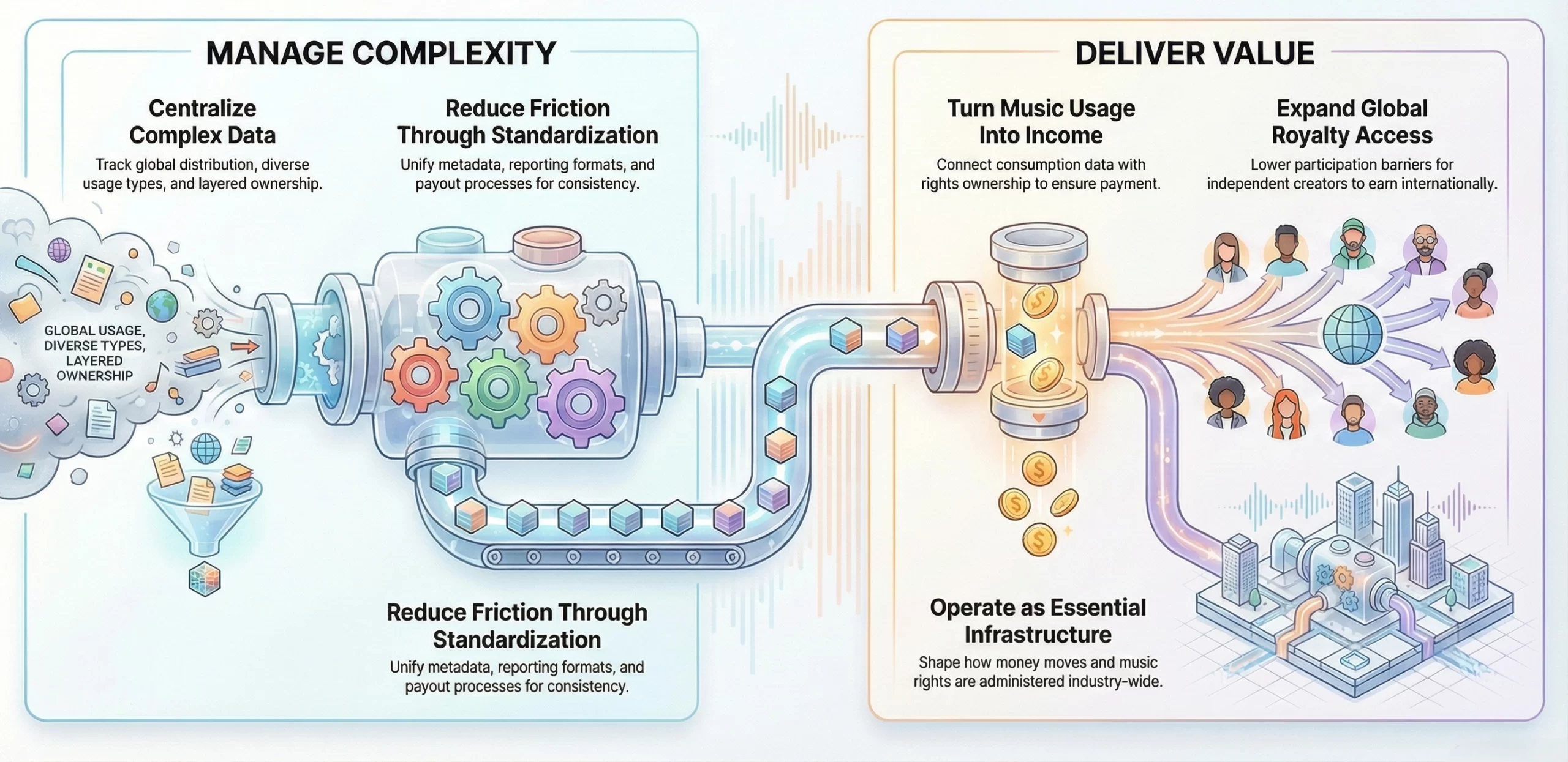 Music royalties platforms exist to coordinate complex systems involving usage tracking, rights ownership, and payments. Their business logic centers on monetizing this coordination, turning fragmented royalty pathways into repeatable and scalable operational processes.
