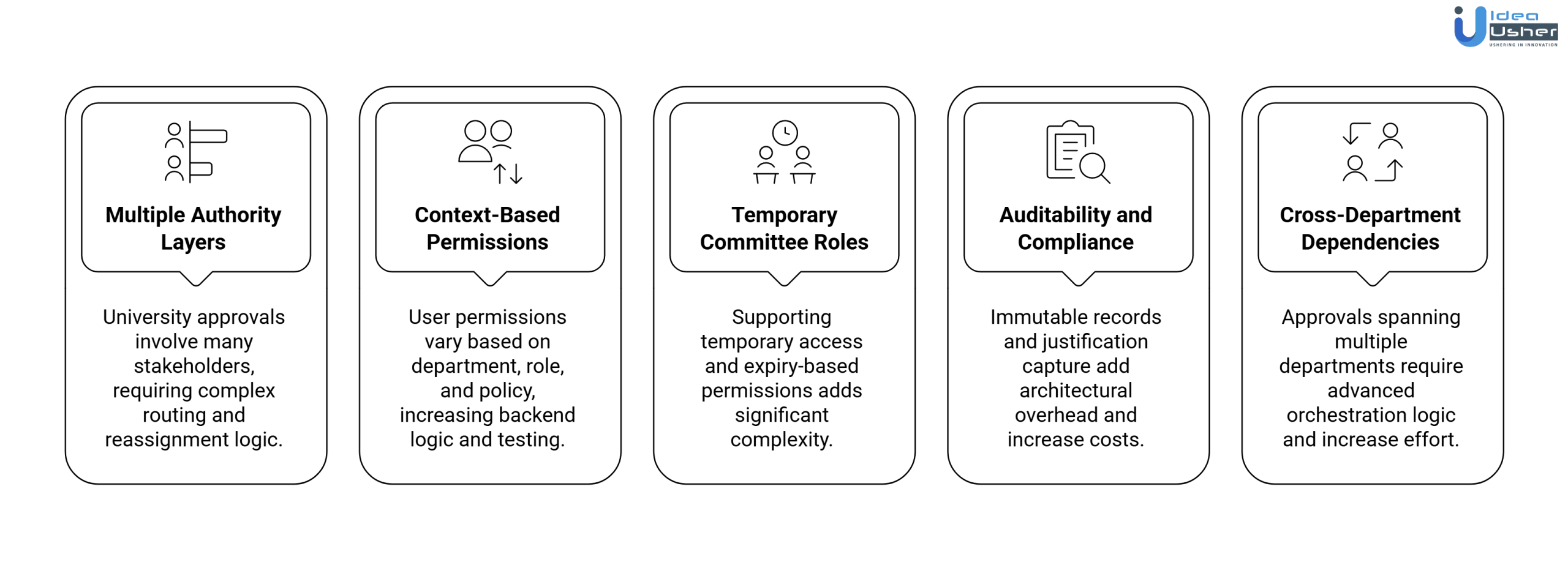 - Role explosion: Students, faculty, HoDs, deans, registrars, finance officers, auditors, super-admins