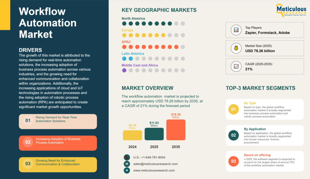 The workflow automation market was valued at USD 9.38 billion in 2024. This market is expected to reach USD 11.63 billion in 2025, and is projected to reach approximately USD 78.26 billion by 2035, at a CAGR of 21% during the forecast period of 2025 to 2035. This rapid growth is driven by universities’ need to scale operations, reduce administrative costs, and meet rising expectations for seamless digital student experiences.